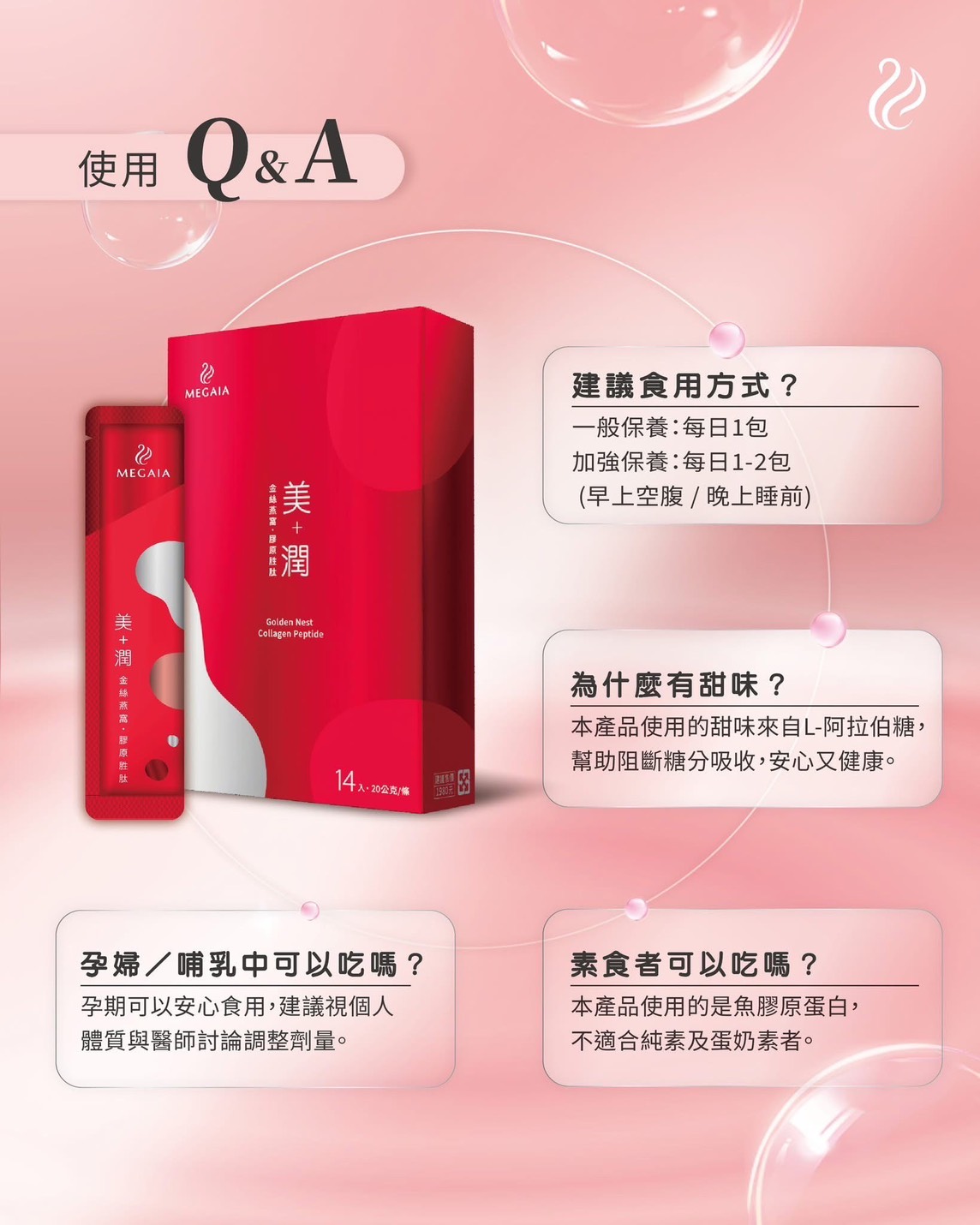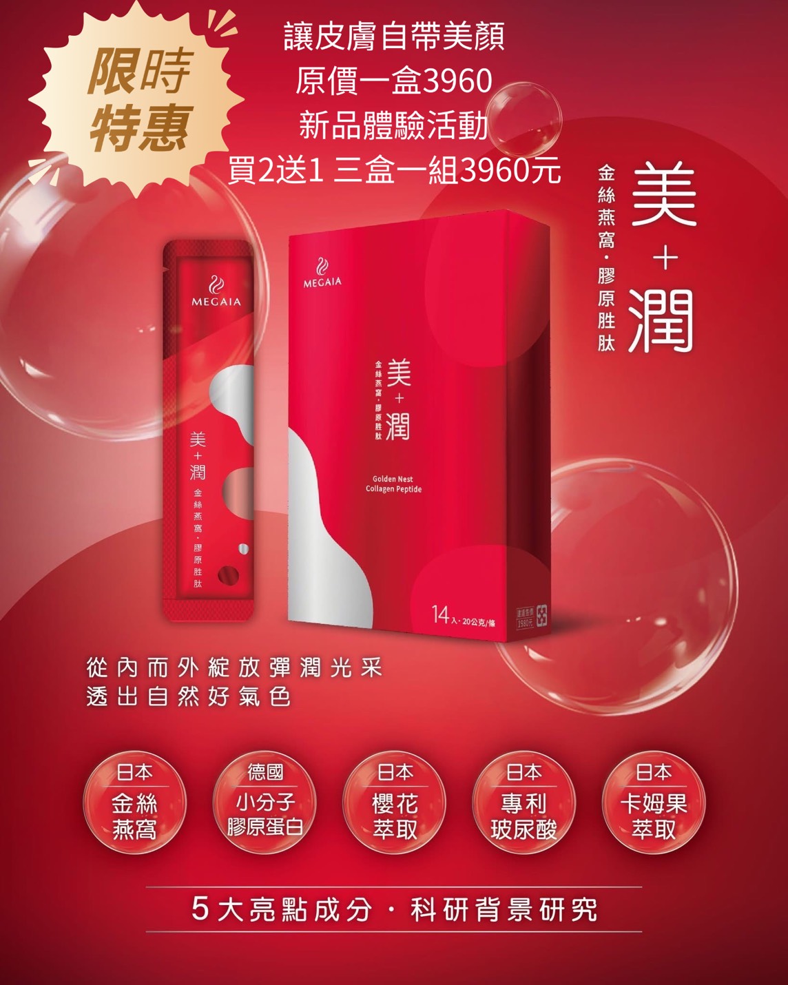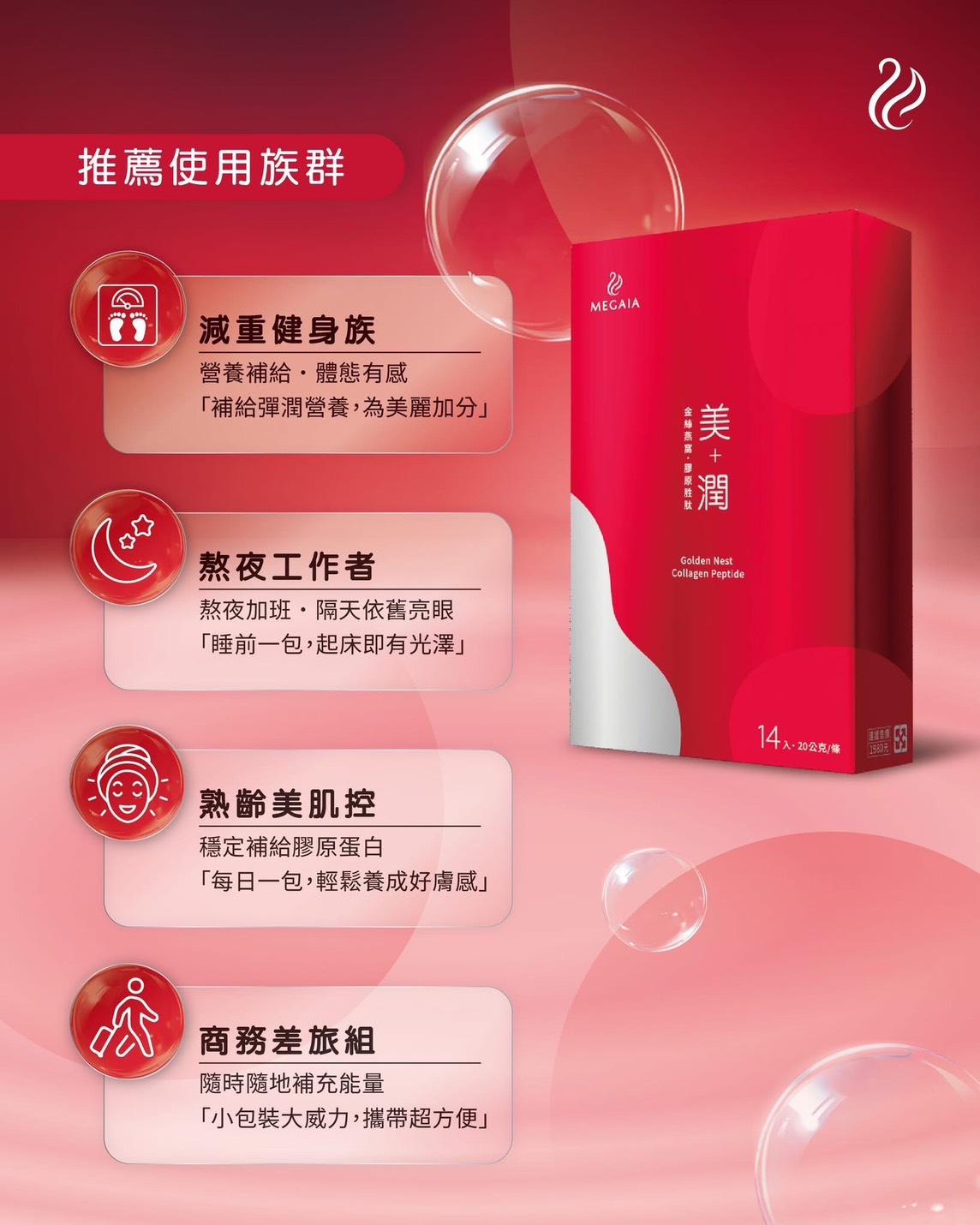 「MEGAIA 美+潤金絲燕窩膠原胜肽」結合日本金絲燕窩、德國小分子膠原蛋白與多種植物精華,從內而外補充膠原蛋白,維持肌膚彈潤光采。小包裝設計,方便隨身攜帶,適合減重健身、熬夜工作、熟齡保養與差旅族群。