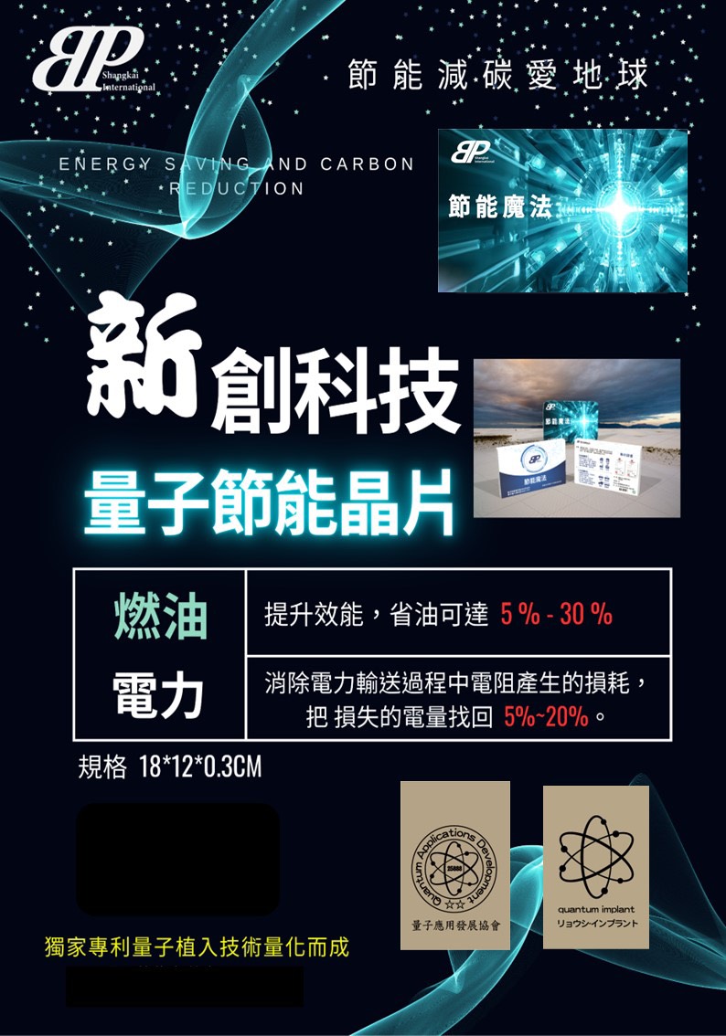 新創科技專利的【量子節能晶片】,運用獨家量子植入技術,幫你省下日常隱形的能源浪費。